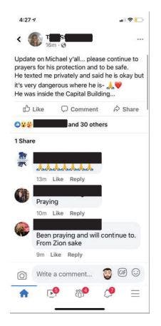 Another Facebook post by Stepakoff's wife reads, "Update on Michael, yall. Please continue to pray for his protection and to be safe. He texted me privately and said he is okay but it’s very dangerous where he is- He was inside the Capitol Building ...”