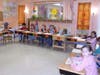 The facility has the feel of a home as opposed to a school building. Student work is displayed throughout. Walls are painted in soft pastel colors, and handmade classroom shelves have subject area knickknacks on display.
