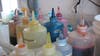 Next is the dyeing table, where bottles of brightly colored dyes allow the clothing a particular neon colors. These are the vibrant colors so iconic in tie-dyed clothing. After applying the stain, the material is set to rest for a period of time; she lets it cure before the next step.