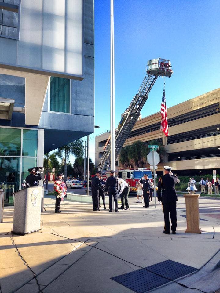 Photo Credit: Members of the Sarasota Police Department held a memorial ceremony to honor the heroes of 9/11 on Thursday. Photo from the Sarasota Police Department Facebook page.