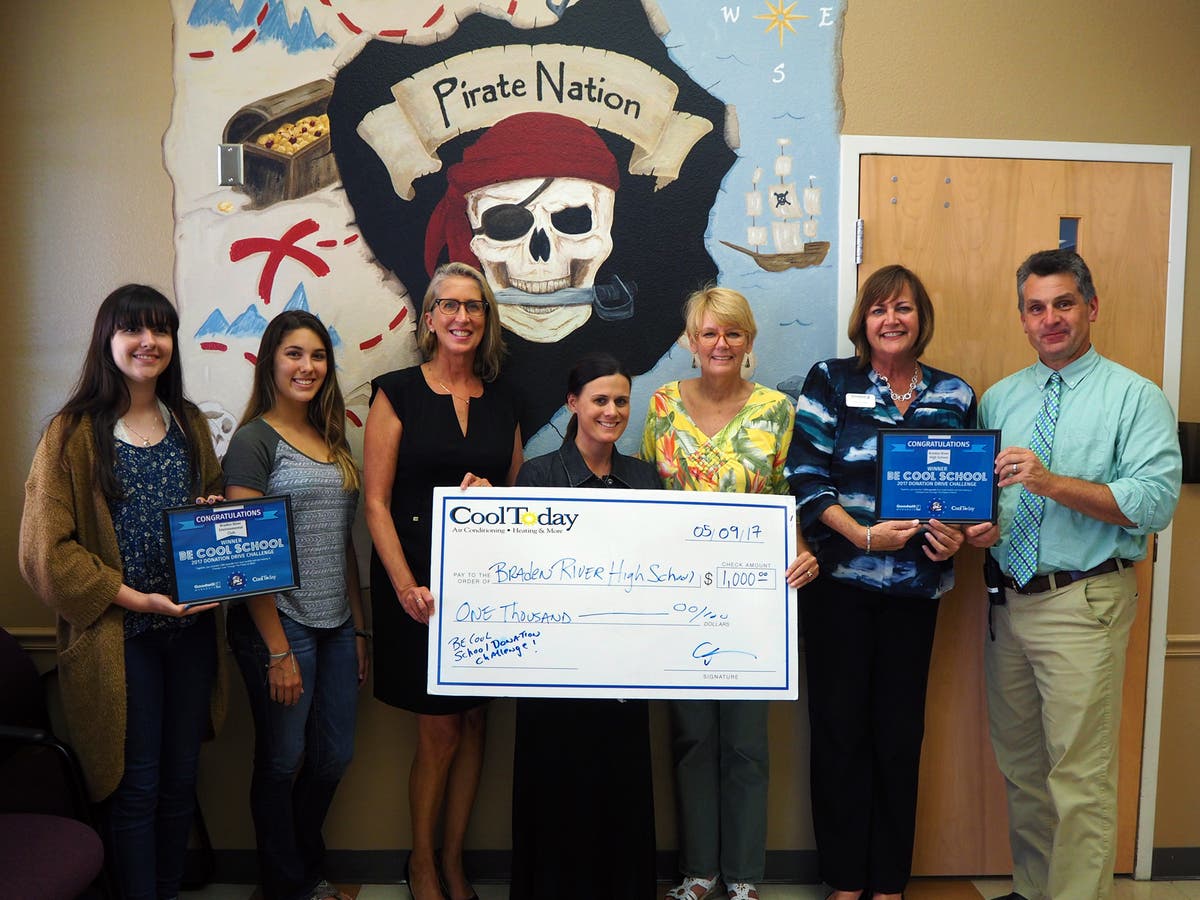 PHOTO ID: Braden River Environmental Club officers Courtney Berardi and Gabriela Sullivan, Lisa Pattison of Cool Today, Principal Jennifer Gilray, teacher and Environmental Club advisor Kim DeHetre, Goodwill’s director of donation development Donna Evans, and Assistant Principal Matt Whelden