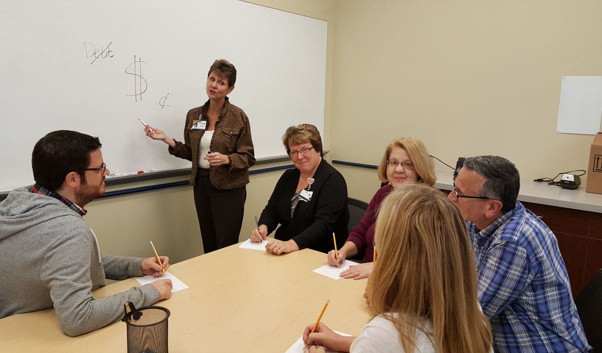 Photo ID: Margie Genter, vice president of mission services for Goodwill Manasota, teaching a class on financial literacy