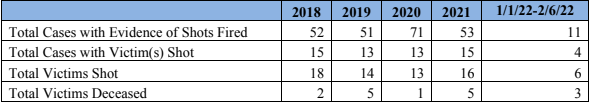 Though it’s been just a little over a month into the new year, the city is on track to possibly outpace its shooting statistics from the last four years. In 2021, there were 53 cases with evidence of shots fired, 15 cases where victims were shot and 16 total victims, including five deaths.