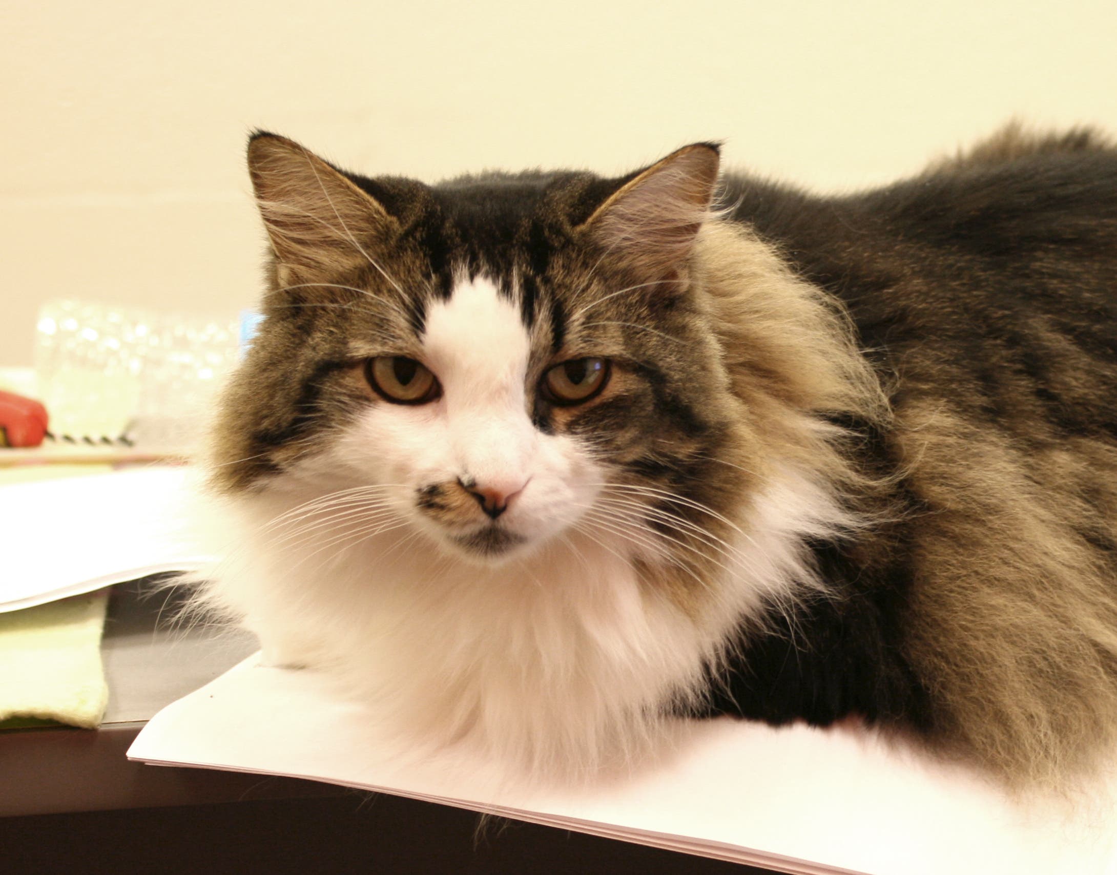My roommate tells me I'm a brat sometimes, but I respectfully disagree. Why can't I lie on her papers and steal her chair without being teased? If you ask me, I'm a very helpful desk mate.