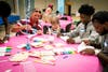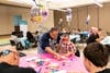 Photos: 1) Fernando Rivera (center standing), director of the JFCS Healthy Fathers Program, assists one of children in making a Father’s Day card for his dad. 2) Family members gather together to make their paper airplane in preparation for the two-person father/child team competition. (Photos courtesy of JFCS)
