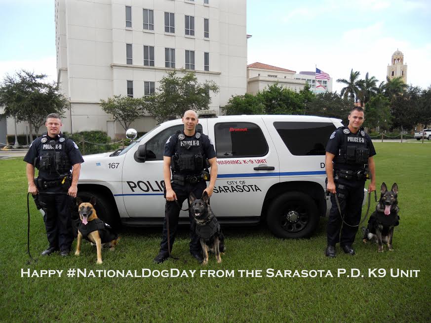 The K9 squad from the Sarasota Police Department proved just that by posing for a quick shot in honor of today’s (Aug. 26) national celebration of man’s best friend. They – and their human handlers – also took time out to wish other critters a “Happy National Dog Day” via the agency’s Facebook page.