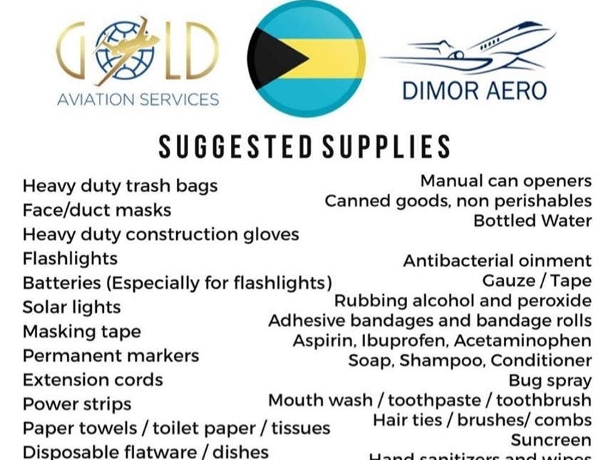 A full list of suggested items and supplies can be found by visiting the Gold Aviation Services Facebook page and include basic hygiene items such as shampoo, soap, toothpaste, medical supplies including antibacterial ointment, gauze/tape, aspirin and Ibuprofen and miscellaneous items such as canned goods and non-perishables, manual can openers and heavy-duty trash bags.