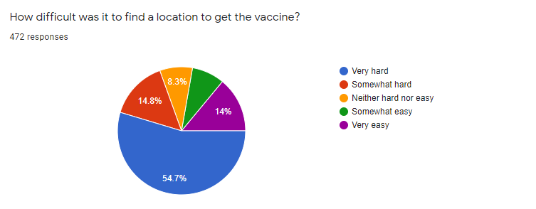 But nearly 55 percent of respondents said it’s been “very hard” finding a location to get the vaccine. Another 15 percent called the experience “somewhat hard.”