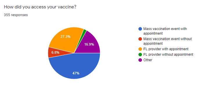 About 27 percent said they received their vaccine by making an appointment with a Florida health care provider, while 2 percent said they were vaccinated by their health care provider without an appointment.