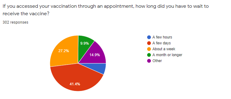 Around 41 percent of those who were vaccinated by appointment said they only needed to wait “a few days” before receiving the vaccine. About 27 percent of respondents said they had to wait about a week for their vaccine appointment, while 10 percent waited a month or longer. Nearly 7 percent received their vaccine within a few hours of registering for an appointment.