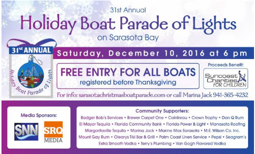 The 31st Annual Sarasota Holiday Boat Parade of Lights will be held on Saturday, December 10, 2016 beginning at 6:00 p.m. The Sarasota Holiday Boat Parade of Lights has been a downtown Sarasota tradition for over 30 years. Cash prizes will be awarded for various vessel classifications. Suncoast Charities for Children and Marina Jack have partnered to chair this event for another year.