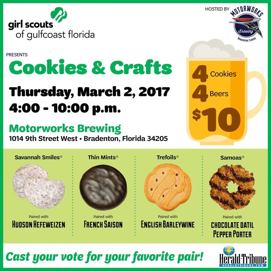 Bradenton, FL – Girl Scouts of Gulfcoast Florida, Motorworks Brewing, and the Herald-Tribune Media Group are teaming up to present a unique event that will delight craft beer and cookie connoisseurs alike.