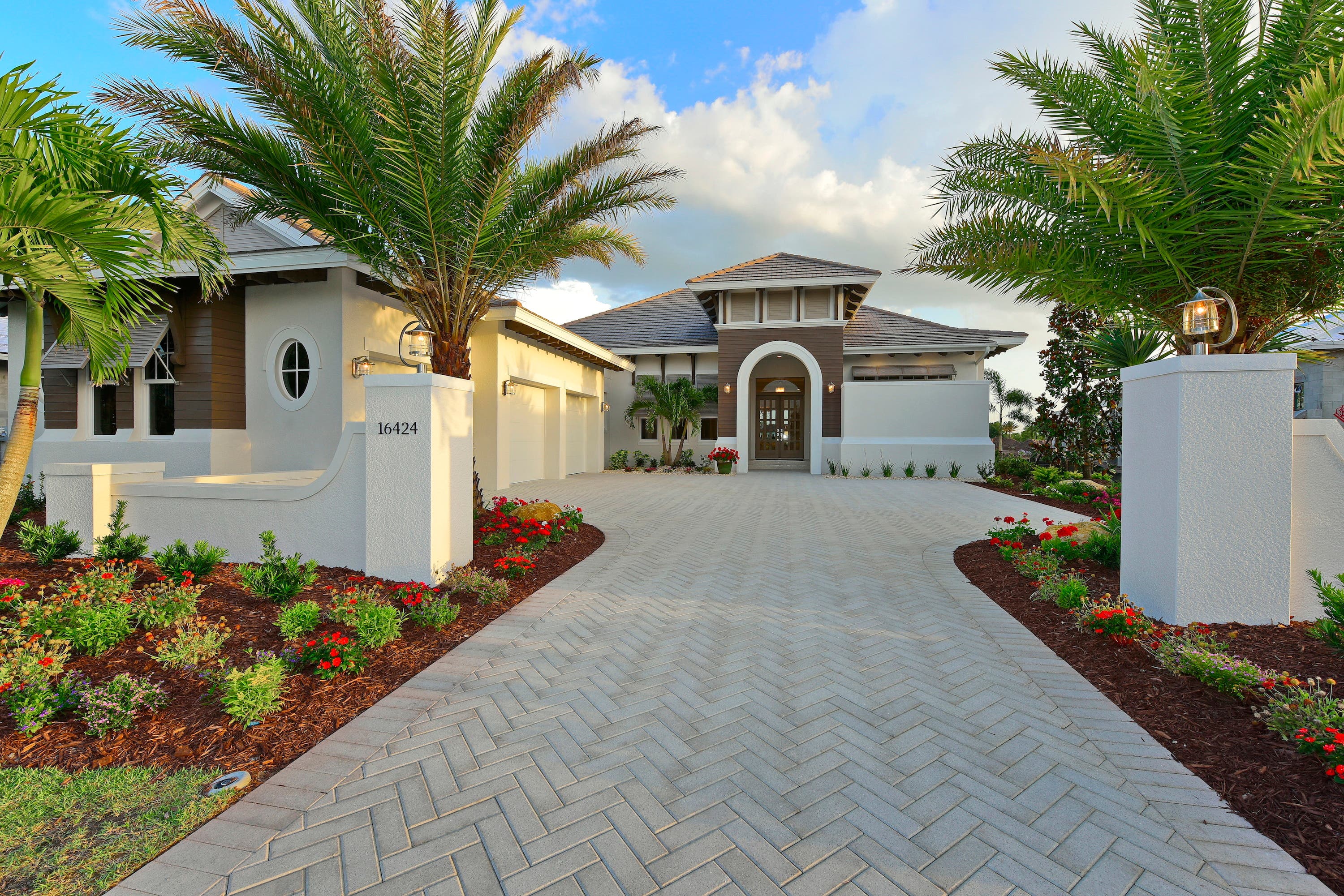 The model embodies the Florida lifestyle, focusing on outdoor living and classic elegance with a tranquil feel. The large lanai and pool area features a naturally finished shell surface, state-of-the-art outdoor kitchen, cascading spa and sunken fire pit overlooking a waterfront view.