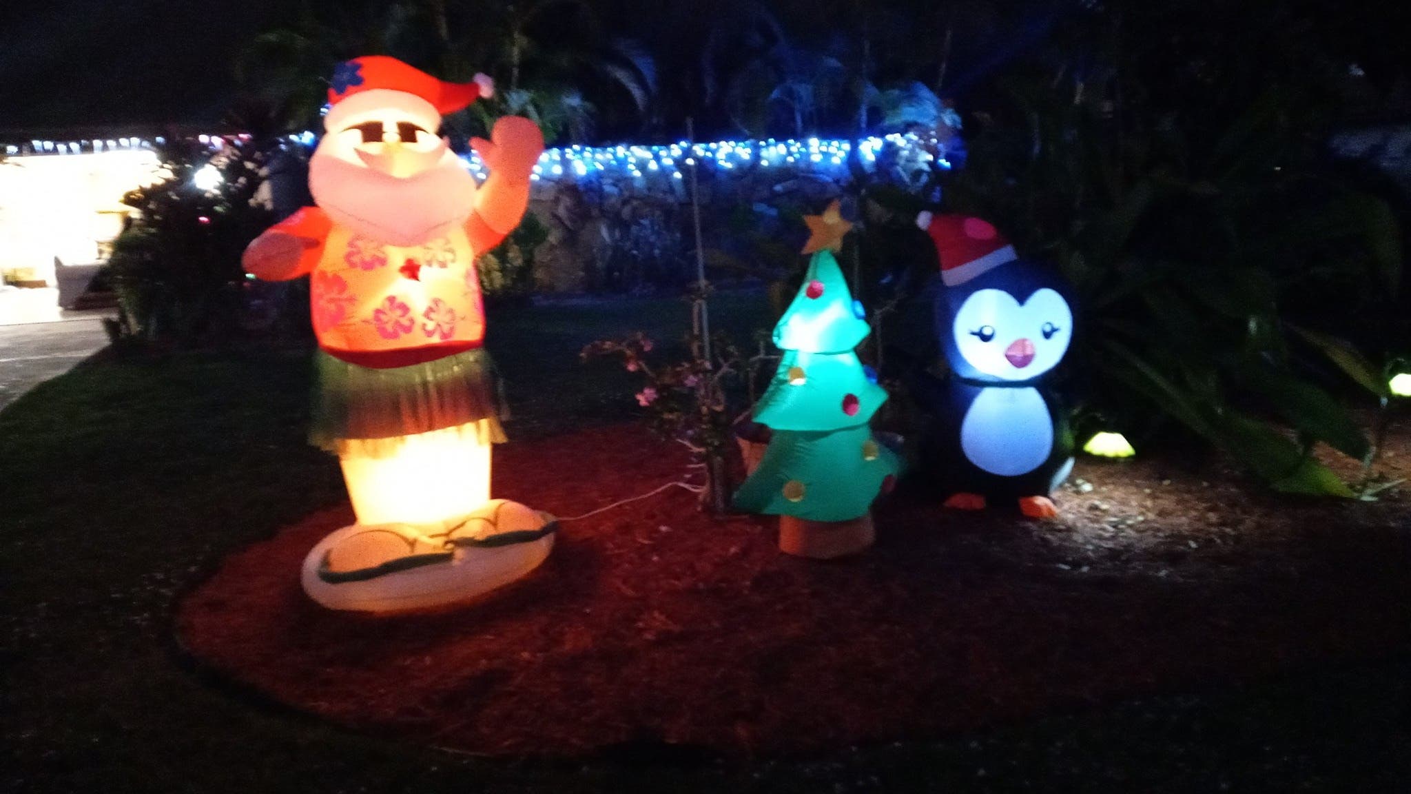 This decorated home features holiday-themed inflatables — including a beach-themed Santa in a Hawaiian shirt and grass skirt — and lights in trees, bushes and other landscaping elements.
