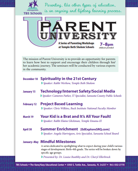 For the first time, Temple Beth Sholom Schools (www.tbsschools.org), a Sarasota preschool to eighth grade private school, will hold Parent University, a series of parenting workshops, beginning Thursday, Jan. 15 from 7 – 8 p.m. in the school’s library.