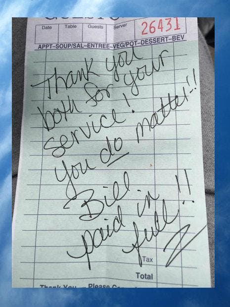 "My husband noticed our waitress's 'Blue Lives Matter' shirt and complimented her on it, and quietly thanked her for her support. I thanked her, as well, and I got a little misty-eyed, as the past couple weeks have been very emotional for our entire nation.