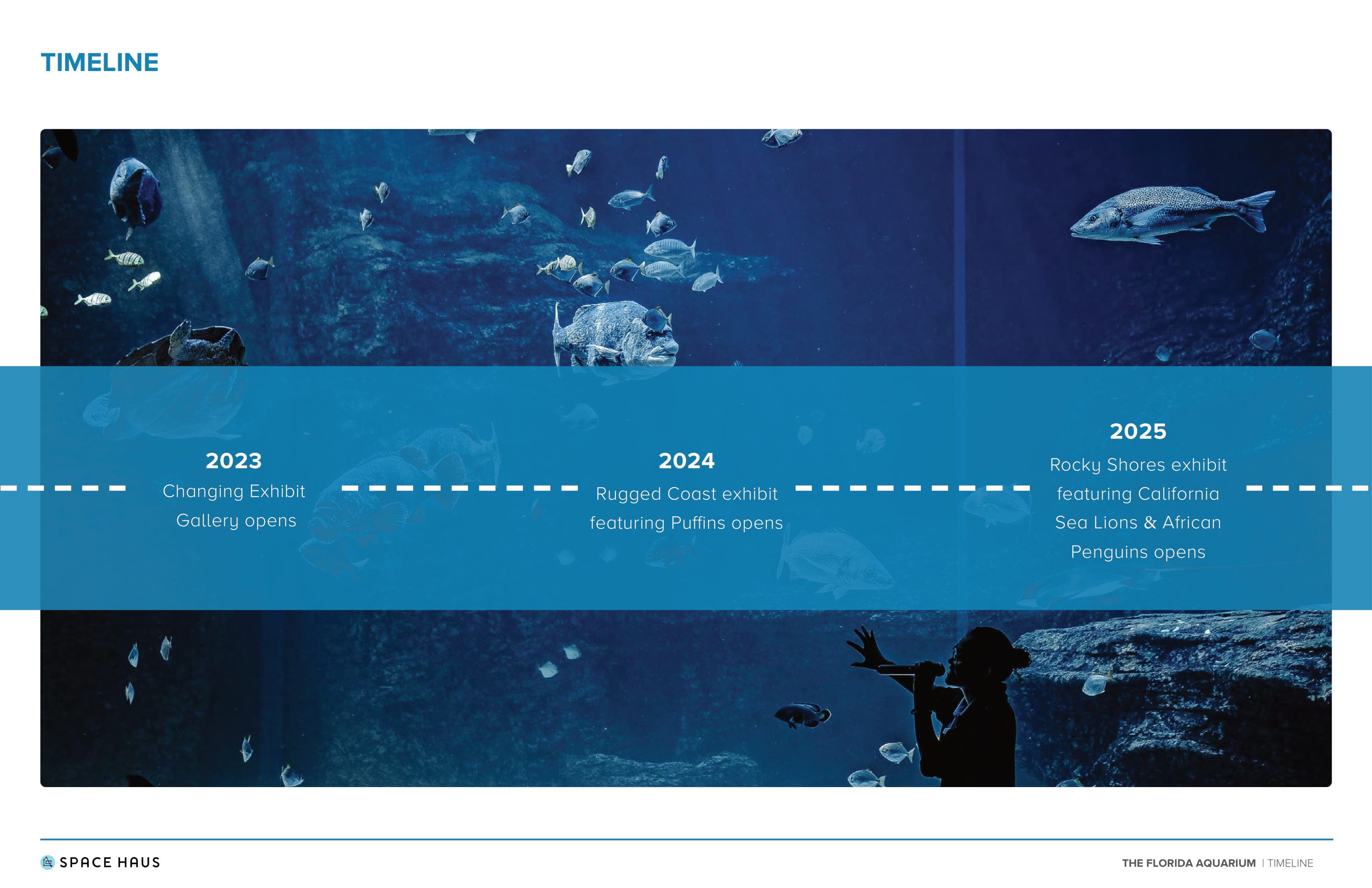 It includes the addition of a rotating special exhibit gallery, converting the second-floor lobby into to multi-species gallery, featuring puffins and a large-scale outdoor exhibit for California sea lions.