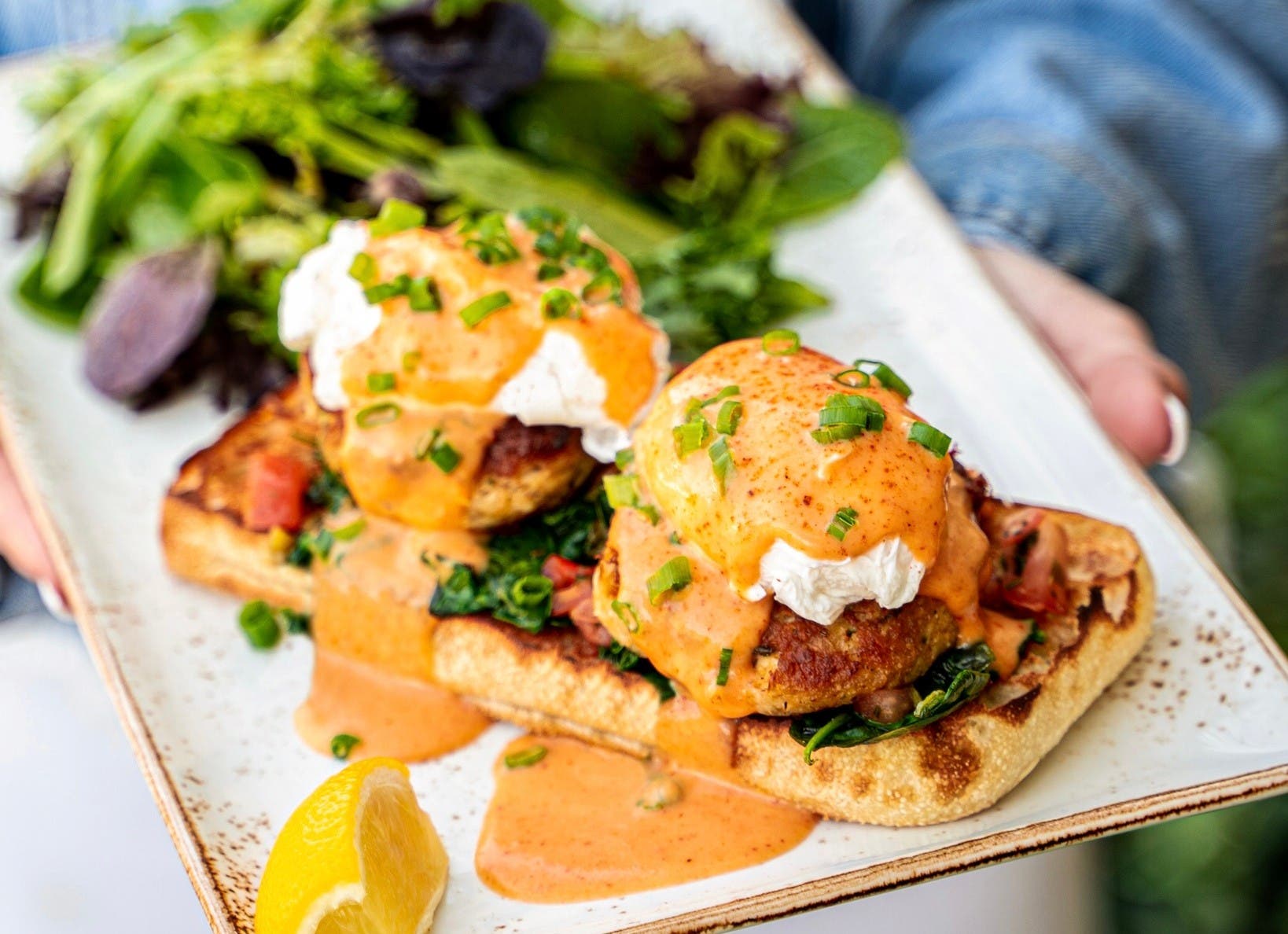 First Watch's Crab Cake Benedict is made with two small-batched Chesapeake Bay-style crab cakes topped with cage-free poached eggs, sautéed baby spinach, house-made pico de gallo and sriracha hollandaise, garnished with scallions and Old Bay seasoning.