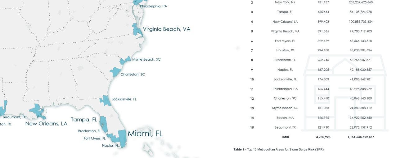 The metro area of Miami, Fort Lauderdale and West Palm Beach continues to have the highest number of homes at risk of storm surge damage — more than 827,000 homes at risk with an RCV of $166 billion.