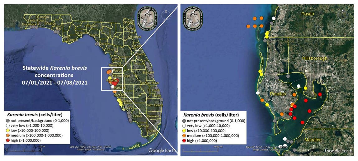 The counties and the FWC are continuing to monitor concentrations of red tide detected in waters around Tampa Bay following Tropical Storm Elsa.