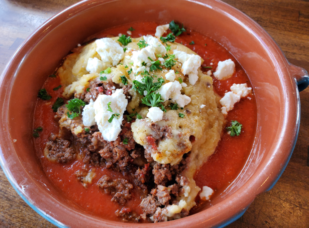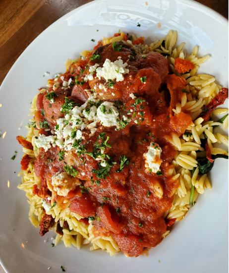 Next up were the Greek meatballs: seasoned and grilled pork and beef topped with plaki sauce and crumbled feta over piping hot spinach orzo. The meatballs were large and flavorful and the sauce was robust. I found myself picking out the bits of sundried tomato in order to scoop up any remaining concentrations of stew-y accompaniment.