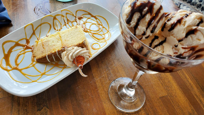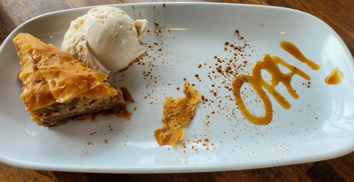 Our meal concluded with an assortment of the baklava, baklava cheesecake, and cinnamon ice cream drizzled with chocolate sauce. If you think you don’t like cheesecake, I am confident that the Acropolis version might convert you; the soft lemon cake crust supported the fluffy cheese filling and was topped with a dollop of whipped cream and a Hershey kiss drizzled in sweet sauce. The baklava was complete with a broad spectrum of spices wrapped within with phyllo pastry, nuts, honey, and a side of ice cream. Let’s face it, there’s nothing worse than runny baklava so I’m happy to report that was not the case here. OPA!