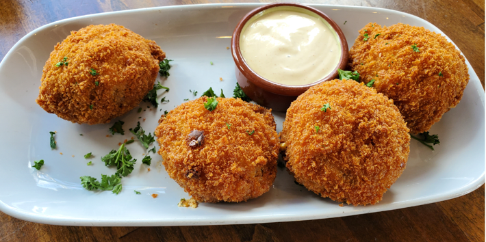 Mushroom caps stuffed with tirokafteri, a blend of feta cheese and herbs, coated in panko bread crumbs and crisp fried. Topped with creamy Acropolis sauce
