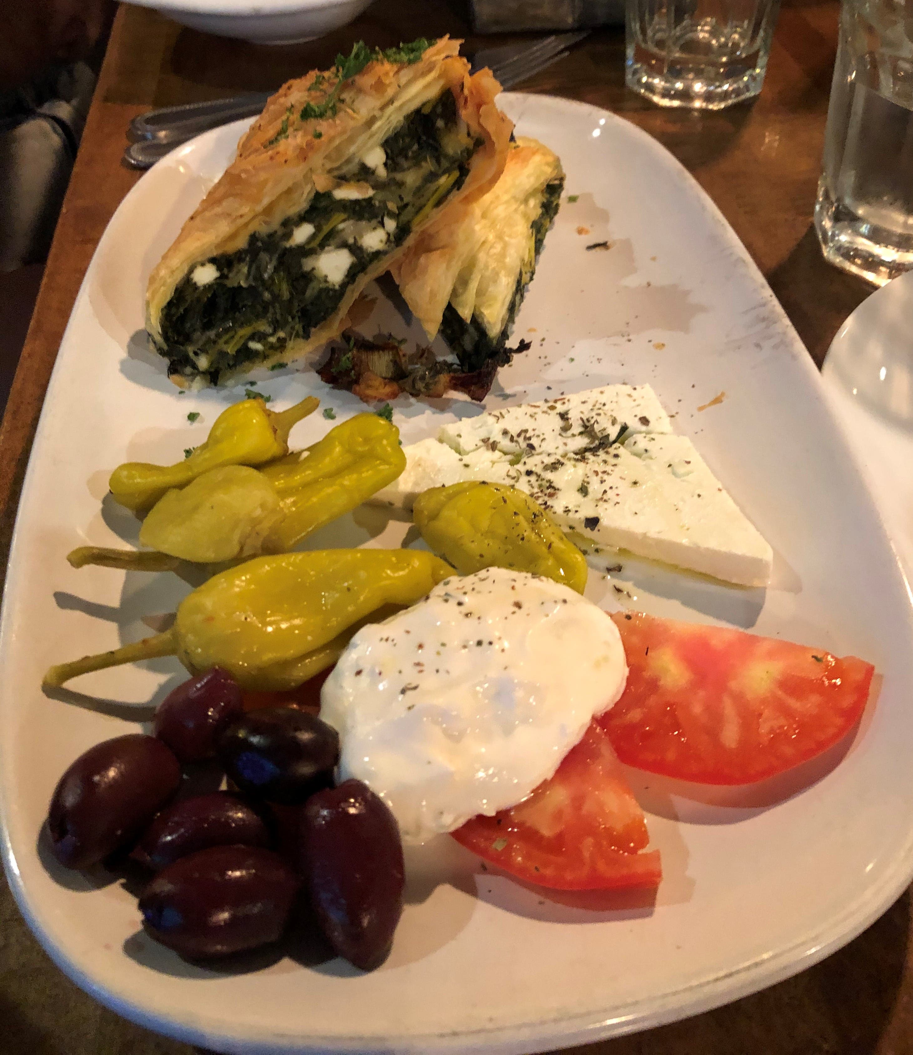Homemade light and flaky phyllo pastry dough stuffed with spinach and cheese. Served with tzatziki