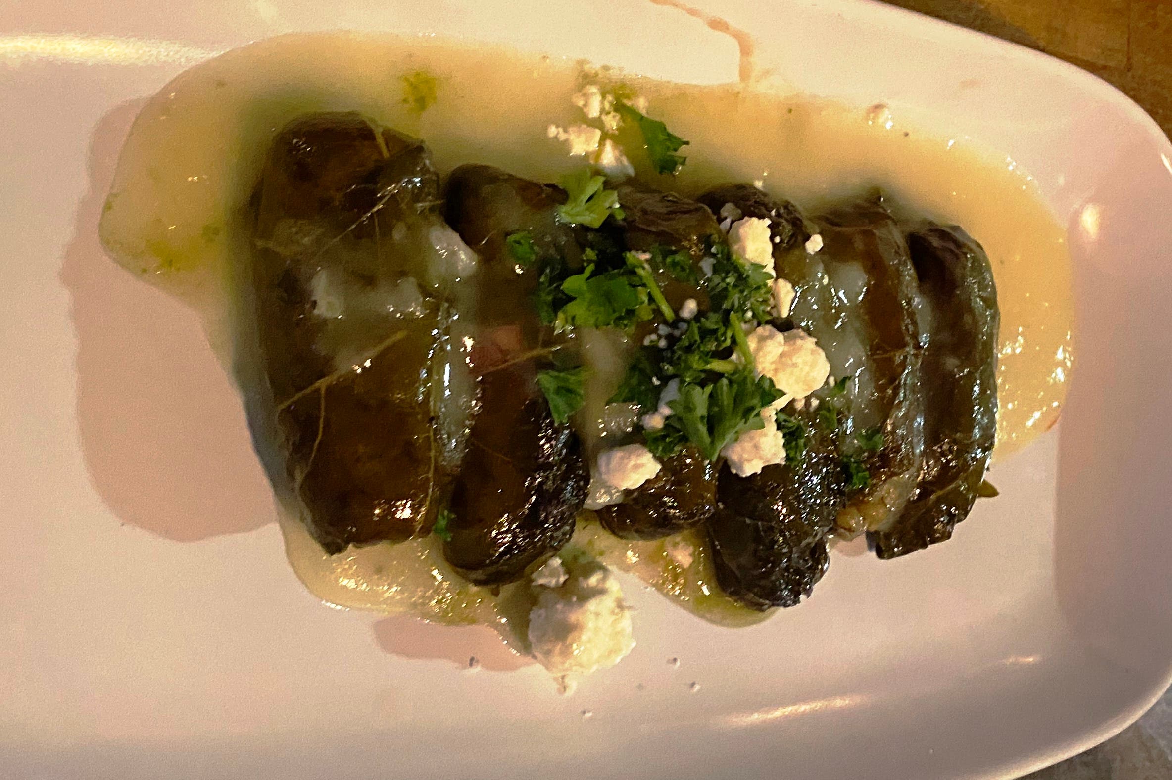 Grapevine leaves stuffed with rice and Greek herbs, topped with crumbled feta cheese and lemon wine sauce. Served with pita