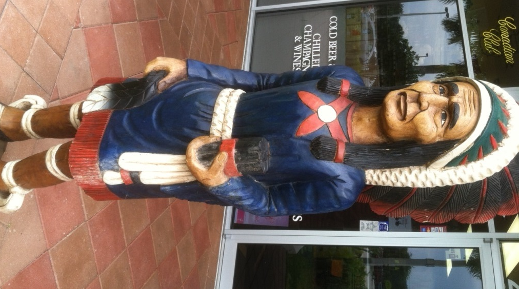 Settlers at the famous Jamestown colony in Virginia grew tobacco based on instructions provided by the Native Americans. The Jamestown settlement was the first English tobacco plantation in Virginia. Leaves were transported by ship and brokers traded the commodity widely in America and Europe. Tobacco has long been associated with Native Americans and using the likeness of a Native American as an advertising tool is how the cigar store Indian was born. Tobacco sellers displayed carved sculptures of Native Americans, typically in full costume and headdress, in an effort to advertise their crops to a tobacco-using and widely illiterate public. As an easy way to advertise to illiterate consumers, tobacco sellers displayed carved images of Native Americans that eventually become known as cigar store Indians.