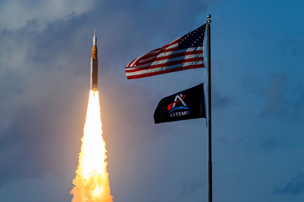 Astronauts, from left, Mission Specialist Jeremy Hansen, of Canada,, Pilot Victor Glover, Commander Reid Wiseman, and Mission Specialist Christina Koch pose for a photo after leaving the Operations and Checkout Building for a trip to Launch Pad 39-B and a planned liftoff on NASA's Artemis II moon rocket. (AP Photo/Chris O'Meara)Artemis II pilot Victor Glover talks with loved ones during the walk out on the way to Launch Complex 39B for their mission to the Moon. (Ricardo Ramirez Buxeda/TNS via ZUMA Press Wire/Shutterstock)From left, Artemis II mission specialist Jeremy Hansen, pilot Victor GLover, mission specialist Christina Koch and commander Reid Wiseman walk out on the way to Launch Complex 39B for their mission to the moon. (Ricardo Ramirez Buxeda/TNS via ZUMA Press Wire/Shutterstock)A NASA Space Launch System (SLS) with the Orion spacecraft carrying the Artemis II astronauts lifts off from Launch Complex 39B. (Jennifer Briggs/ZUMA Press Wire/Shutterstock)The rocket takes off from its base. (AP Photo/Chris O'Meara)Birds fly by as the rocket ascends. (Joel Kowsky - NASA via CNP/Shutterstock)The rocket rushes past the flag pole with the Artemis logo and American flag. (Jennifer Briggs/ZUMA Press Wire/Shutterstock)The moon rocket lifts off into the sky. (AP Photo/Chris O'Meara)The rocket begins to disappear in the sky. (Mauricio Paiz/NurPhoto/Shutterstock)Smoke is left on the horizon after take off. (Mauricio Paiz/NurPhoto/Shutterstock)The Artemis II mission Space Launch System solid rocket boosters carrying the manned Orion Integrity capsule separate from the main rocket down range after blasting off from Kennedy Space Center, Florida, on Wednesday, April 1, 2026. The crew of three NASA astronauts and one Canadian Space Agency astronaut will circle in the moon on their 10-day mission, which will be the first lunar trip in over 50 years. (Pat Benic/UPI/Shutterstock)Spectators look on from the A. Max Brewer Bridge. (AP Photo/Phelan M. Ebenhack)