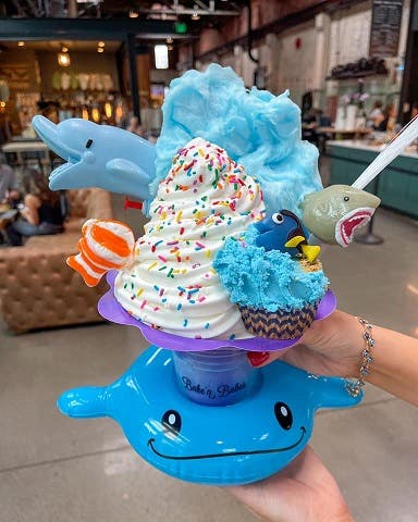 Bake'n Bakes is now featuring the August Works — signature vanilla soft serve topped with a vanilla cupcake with a fish gummy, a water gun, cotton candy, shark light-up wand, fish lollipop and sprinkles served in an inflatable sea creature cup holder.