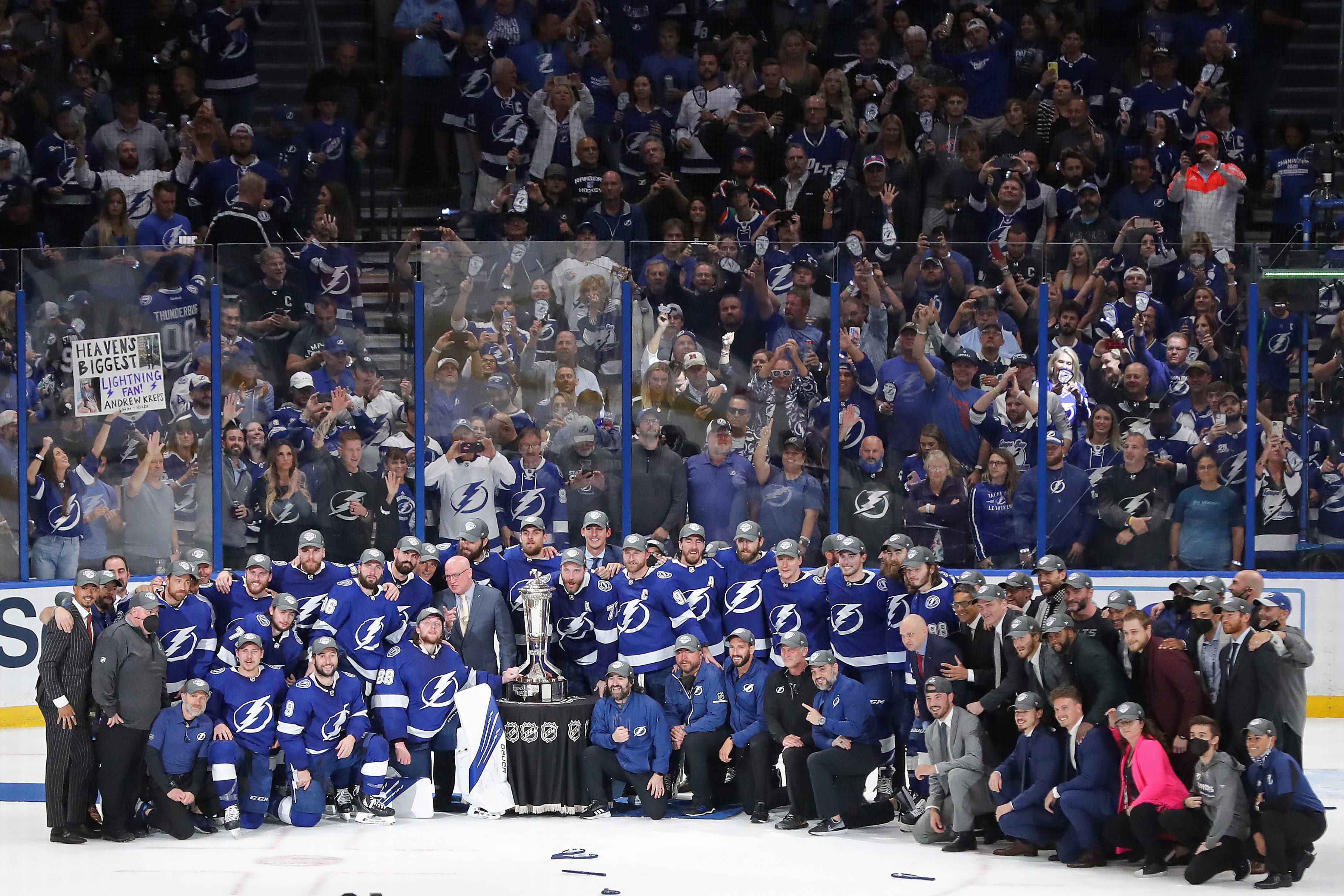 Players and staff of the Tampa Bay Lightning pose with the Prince of Wales Trophy after their 1-0 win against the New York Islanders in Game Seven of the NHL Stanley Cup Semifinals during the 2021 NHL Stanley Cup Finals at Amalie Arena.