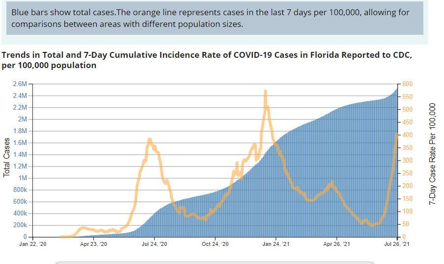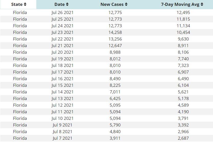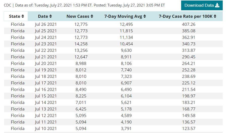 As of Monday, Florida had 407.26 new cases per 100,000 people during a seven-day period. There were 12,775 new cases of coronavirus reported in the state on Monday alone.