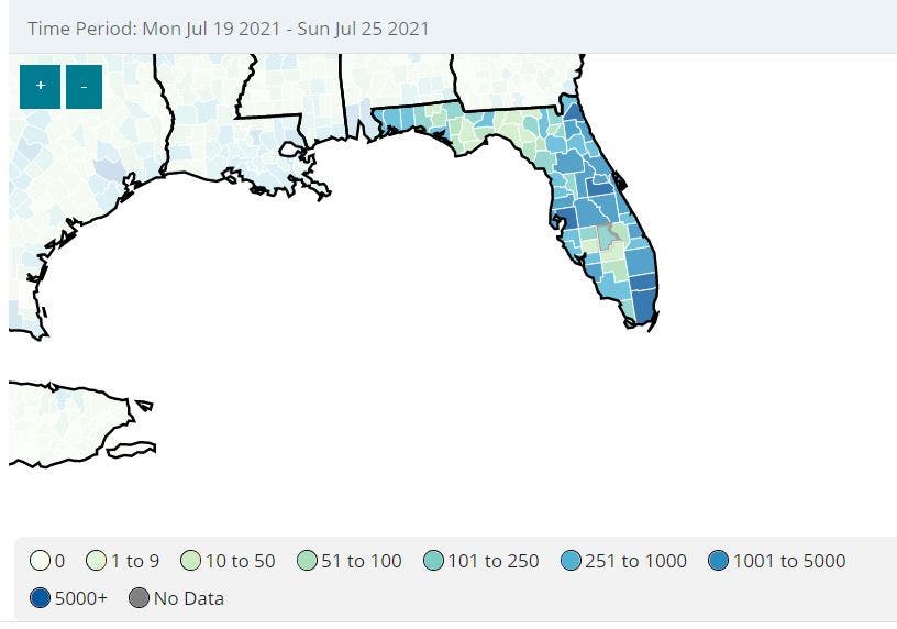 CDC data shows the Florida counties with 5,000 or more cases from July 19 to July 25 include Hillsborough, Miami-Dade, Duval and Orange counties.