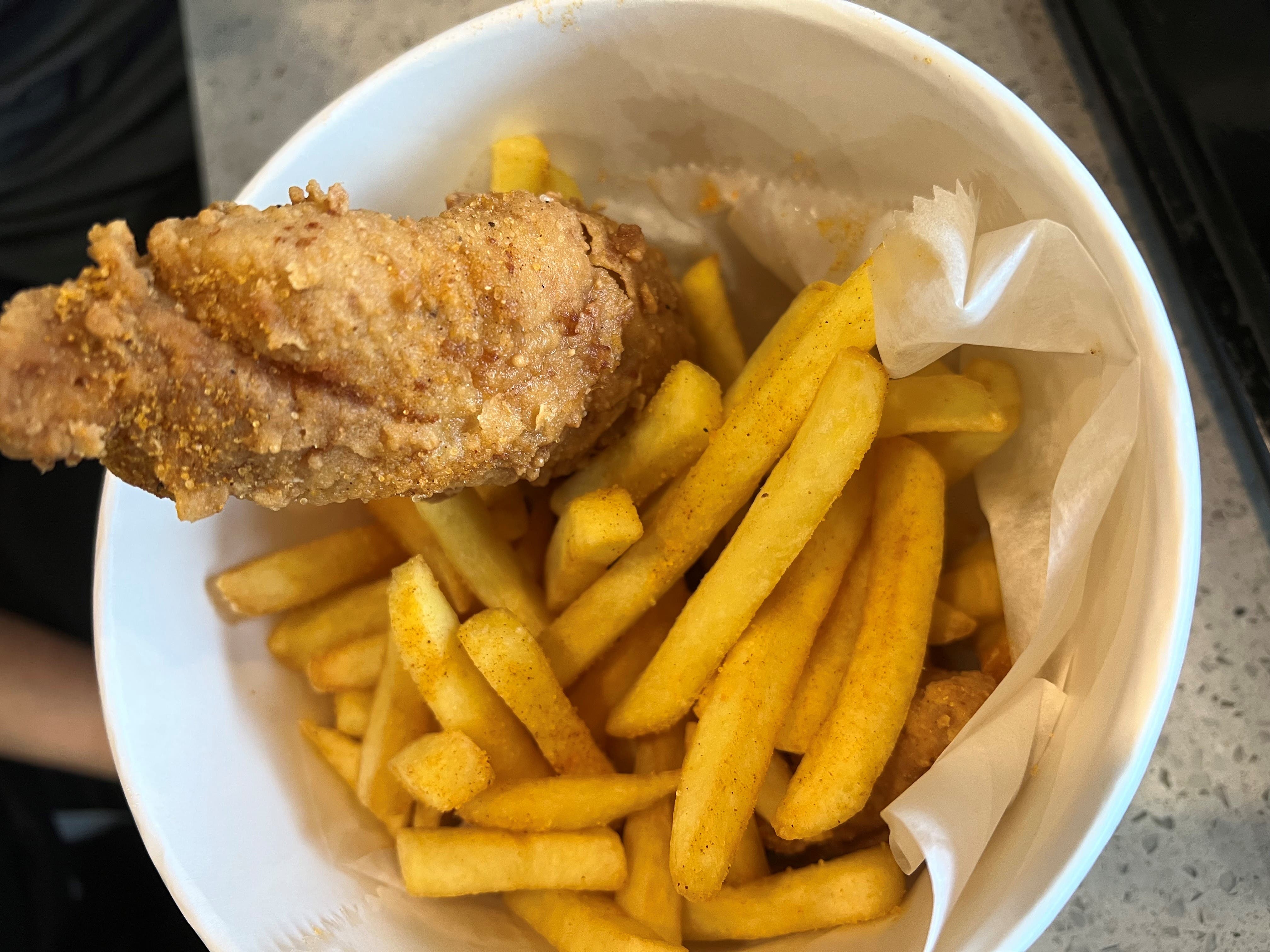 With two grandchildren in tow, sights are quickly set on the chicken tender baskets. I have joked for years that I should have a blog called Whine and Dine. The site would feature these kids' reviews of chicken nuggets, tenders and french fries over the last seven years. So, we had some well-qualified tender snobs to rate the meal. I am happy to report the tenders were large, juicy and perfectly crispy. All appointed 5 stars and a thumbs up to the french fries as well.