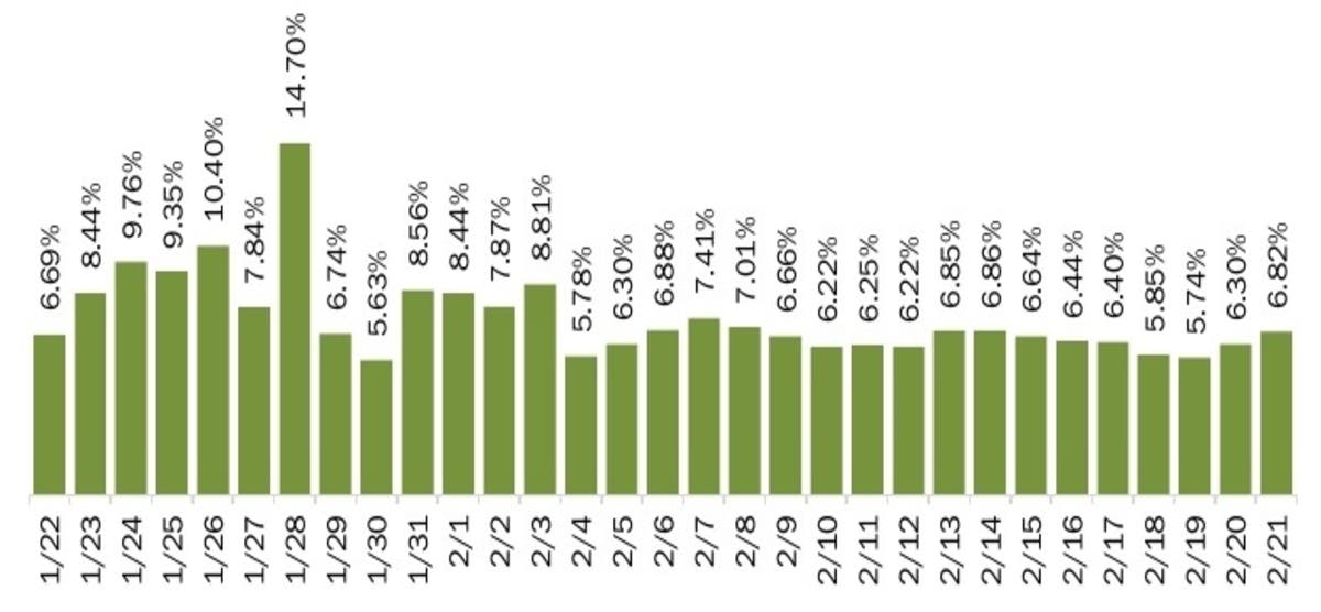 After falling to a 5.74 positivity rate on Friday, the lowest since Jan. 30 when the state posted a 5.54 percent positivity rate, the state's overall rate drifted back up to 6.82 percent Monday.