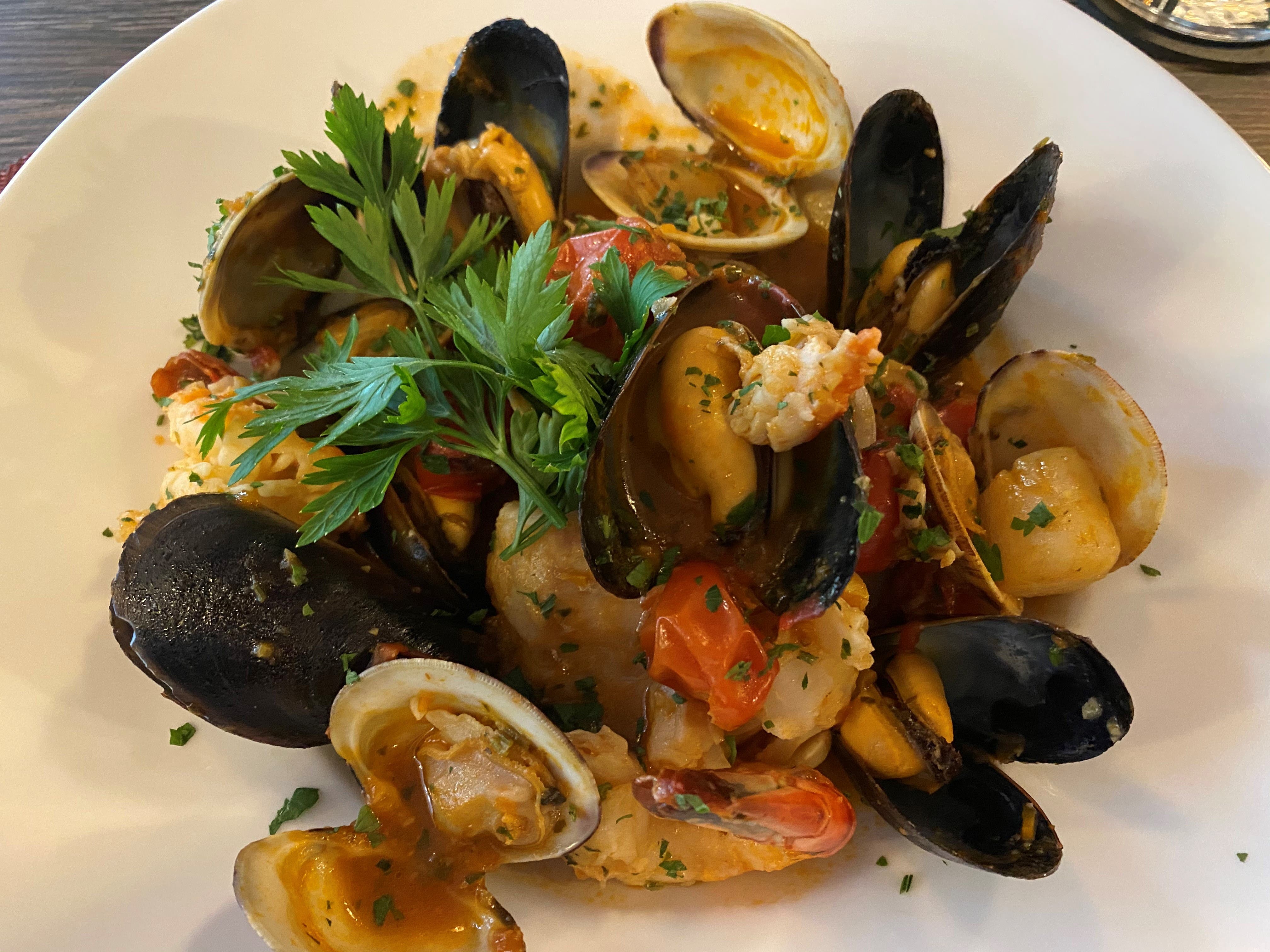 Fresh assorted seafood stewed with herbs and tomato served with house made focaccia was bursting with flavor.