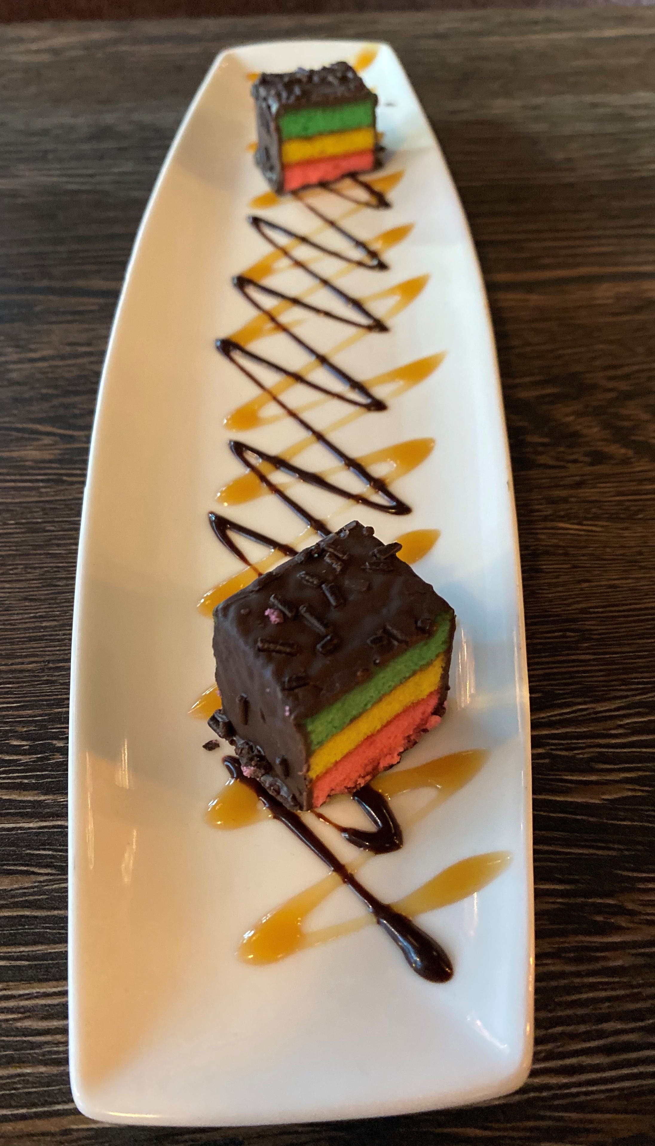 Now for that dessert. Not on the menu but a pleasant surprise a high-end version of what I know as an Italian Rainbow Cookie.