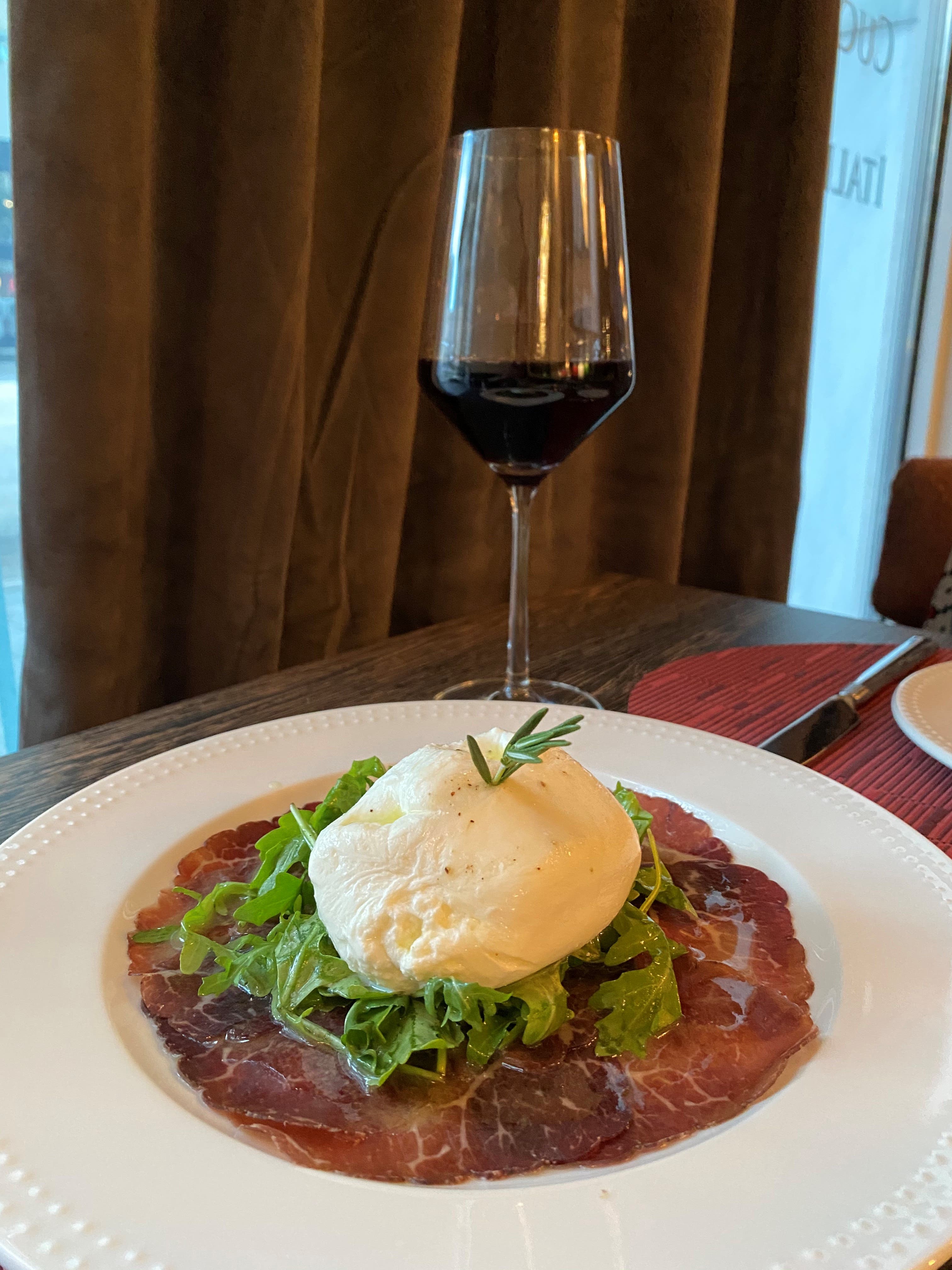 Fresh Burrata cheese paired with dry cured beef carpaccio drizzled with truffle oil.