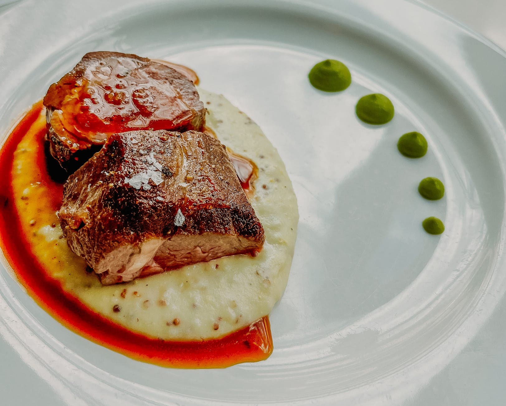 - Braised lamb shank ($38) with herb-scented jus, truffle mashed potatoes, roasted butternut squash and grape salsa.