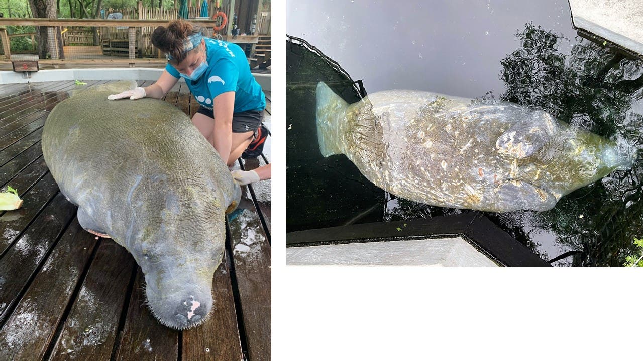 "She looks like a completely different manatee," said Molly Lippincott, curator of Florida Manatees for ZooTampa. "She arrived at our manatee critical care center on March 9, 2021, emaciated and had wounds to her body and flipper from exposure. Bellissima was at least 300 pounds underweight and had severe injuries on her flippers."