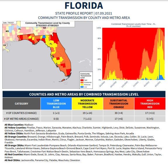 Manatee, Orange, Duval, Escambia, Broward and Miami-Dade counties have "high" transmission levels.