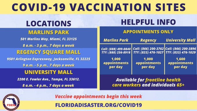 Among them, the state set up three state-run vaccination sites manned by contracted nurses and members of the Florida National Guard. The new sites are located at the University Square Mall in Tampa, Marlins Park in Miami and Regency Square in Jacksonville.