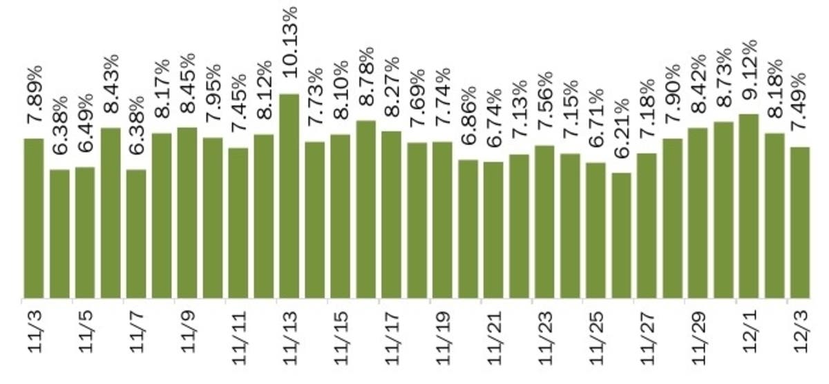 In the past month, Florida's positivity rate has fluctuated between 6.21 percent and 10.13 percent. As of Thursday, the positivity rate was 7.49 percent.