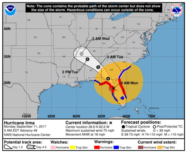 "Although the amount of intensification expected from Irma has been decreased with the latest forecasts through Sunday morning, make no mistake that Irma is still a dangerous hurricane and is forecast to move near or over the west coast of the Florida peninsula Sunday through early Monday morning with the potential for significant and life threatening impacts from wind, surge and rain," weather service forecasters wrote Sunday morning. "Winds will gust to tropical storm force as fast-moving squalls move across southwest Florida early this morning. These squalls will increase in frequency and intensity during today as the outer rain bands of Irma spread north over the Florida peninsula. Given the current forecast track, a period of damaging winds is expected across all of west-central and southwest Florida between late Sunday morning and Monday morning."