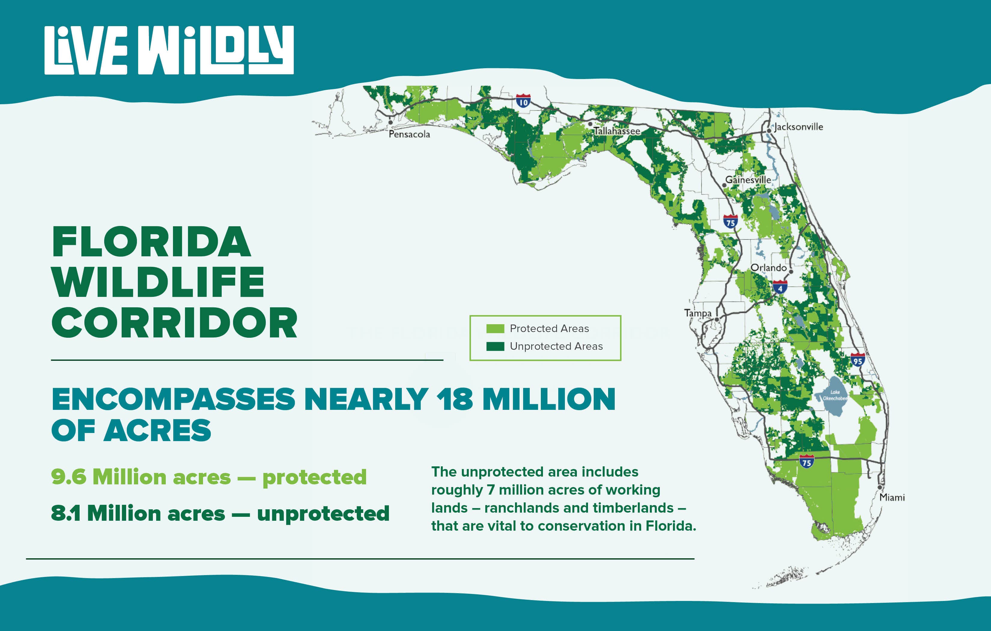 "With more than 1,000 people moving to Florida every day, preserving these unprotected areas and positioning nature as a green infrastructure solution for the state is even more urgent," said Bellini. "Yet, few Floridians are aware of the corridor, its impact or the urgency to connect it — and that's where Live Wildly comes in. When we connect citizens to the corridor through the things they care about most, we capture their hearts and mobilize action."