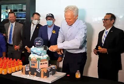 David Neeleman cuts the cake during an event celebrating Breeze Airways' inaugural flight.