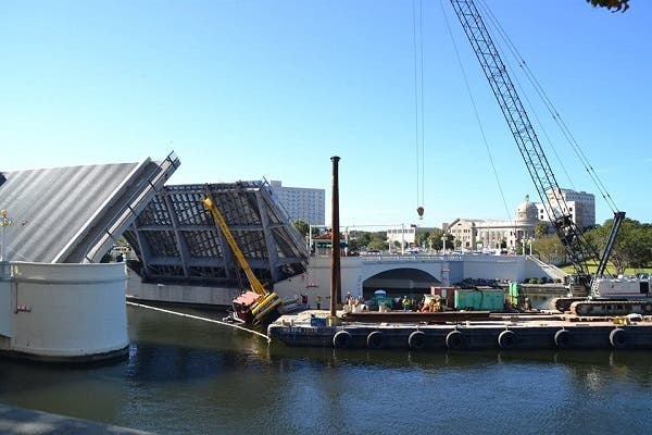 A barge carrying a crane for construction on the Kennedy segment of the Tampa Riverwalk hit the bridge, leaving it stuck in the upright position. Kennedy Boulevard is now closed in both directions between Ashley Drive and North Boulevard, according to the City of Tampa.