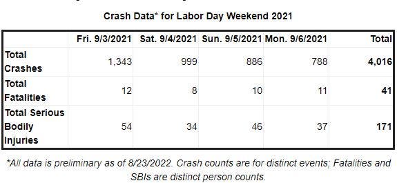 According to FLHSMV data, last year 4,016 crashes occurred from the Friday before Labor Day through Labor Day across Florida. During this four-day period, there were 41 fatalities from crashes, eight of which involved drugs or alcohol.